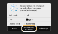 1 | Posizionare l'originale successivo sul vetro di lettura e selezionare <Scansione orig. successivo>. È inoltre possibile specificare <Selezione colore>, <Tipo originale>, <Densità> e <Bilanciamento colori> separatamente per ciascun originale. ![]() Ripetere questa operazione finché non si termina la scansione dell'intero originale. |