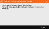 Quando il serbatoio del toner di scarto è quasi pieno o completamente pieno, appare un messaggio che richiede di preparare un nuovo serbatoio del toner di scarto o di sostituire il serbatoio del toner di scarto. Preparare un nuovo serbatoio del toner di scarto o eseguire la sostituzione del serbatoio conformemente al messaggio visualizzato.