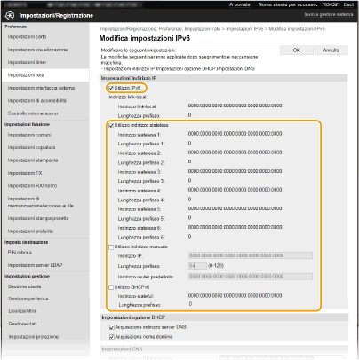 Indirizzo link-local | Un indirizzo che è valido solo entro una subnet o collegamento e non può essere utilizzato per comunicare con dispositivi oltre a un router. Un indirizzo link-local viene impostato automaticamente quando la funzione IPv6 della macchina è abilitata. |