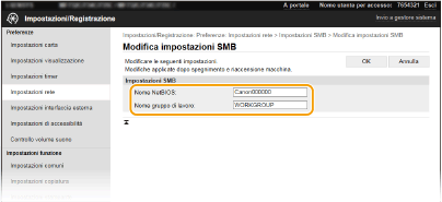 Server Message Block (SMB) è un protocollo per la condivisione di risorse, come file e stampanti, con più di un dispositivo in una rete. La macchina utilizza SMB per archiviare documenti digitalizzati in una cartella condivisa. A seconda della rete, sarà necessario impostare il nome NetBIOS e il nome del gruppo di lavoro.