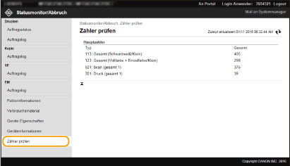 Die Gesamtzahl der mit der Druck-, Kopier- und Faxfunktion gedruckten Seiten wird angezeigt.