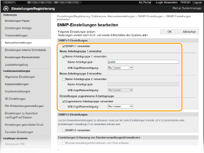 Deaktivieren Sie SNMPv1Wenn Sie SNMPv1 deaktivieren, stehen einige der Funktionen des Geräts nicht mehr zur Verfügung, so auch das Abrufen von Geräteinformationen über den Druckertreiber. Verwenden des Bedienfelds |