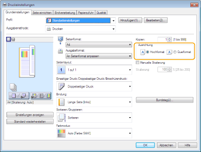 2 | Auf dem Bildschirm [Grundeinstellungen] des Treibers stellen Sie [Ausrichtung] auf die gleiche Ausrichtung ein, die Sie in Schritt 1 eingestellt haben. |