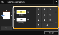2 | Especifique la longitud del lado <X> y del lado <Y>. Seleccione <X> o <Y> e introduzca la longitud de cada cara con las teclas numéricas. ![]() ![]() Si registra el tamaño de papel que utiliza con más frecuencia en los botones <S1> a <S3>, puede recuperarlo con una tecla abreviada. Registro de tamaños de papel personalizados |