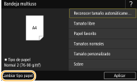 Opciones de papel en el equipoSi <Priorizar opc. controlador al imprimir> se ajusta en <On>, las opciones del controlador de impresora tendrán prioridad cuando la bandeja multiuso esté especificada como origen del papel para trabajos desde el controlador de impresora. <Priorizar opc. controlador al imprimir> Si la pantalla anterior no aparece cuando hay papel cargadoSi siempre carga el mismo papel en la bandeja multiuso, puede omitir las operaciones de configuración del papel registrando el tamaño y el tipo de papel como opción predeterminada. Sin embargo, si se registra la opción predeterminada, la pantalla anterior no aparecerá. Para visualizar la pantalla, seleccione <Especificar cuando cargue papel> (Fijar el tamaño y el tipo de papel para usar con la bandeja multiuso). Al cambiar solo el tipo de papelSiga el paso 2 y los pasos siguientes. |
