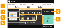 Se muestra el estado de configuración, como la escala de copia, el papel de copia y el número de copias. Para copiar correctamente, asegúrese de comprobar las opciones que se muestran aquí. Cuando quiera cambiar una opción, seleccione el elemento que va a configurar.