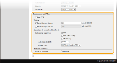 Seleccione las casillas de verificación [ESP], [ESP (AES-GCM)] o [AH (SHA1)] en función del encabezado IPSec y el algoritmo utilizados. AES-GCM es un algoritmo tanto de autenticación como de cifrado. Si se selecciona [ESP], seleccione también algoritmos de autenticación y cifrado en las listas desplegables [Autenticación ESP] y [Cifrado ESP].