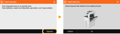 En algunos casos, cuando se produce un error, aparecen instrucciones sobre cómo responder ante dicho error. Siga las instrucciones de la pantalla para solucionar el problema. La pantalla que aparece cuando se produce un atasco de papel se muestra a continuación a modo de ejemplo.