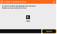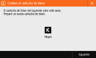 Cuando el tóner empiece a terminarse o se haya agotado, aparecerá un mensaje indicándole que prepare un nuevo cartucho de tóner o sustituya el cartucho de tóner. Prepare un nuevo cartucho de tóner o sustituya el cartucho de tóner de acuerdo con el mensaje mostrado.