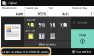 Las copias e impresiones pueden ser expulsadas al equipamiento opcional mientras repone las grapas, de modo que debe tener cuidado al manipular el equipamiento opcional que está instalado en el equipo. |