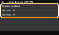 <Seleccionar manualmente> Cuando coloca originales LTRR o STMT en el cristal de la platina, la pantalla para especificar el tamaño del original aparece durante la lectura. <Usar formato LTRR> Cuando coloca originales LTRR o STMT en el cristal de la platina, el original se lee con el tamaño LTRR durante la lectura. <Usar formato STMT> Cuando coloca originales LTRR o STMT en el cristal de la platina, el original se lee con el tamaño STMT durante la lectura. |