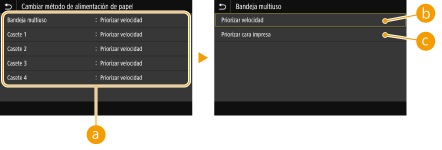 <Bandeja multiuso> <Priorizar velocidad>  <Priorizar cara impresa> <Casete 1> <Priorizar velocidad>  <Priorizar cara impresa> <Casete 2> <Priorizar velocidad>  <Priorizar cara impresa> <Casete 3>*1 <Priorizar velocidad>  <Priorizar cara impresa> <Casete 4>*1 <Priorizar velocidad>  <Priorizar cara impresa> |