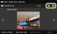 Puede especificar el método de visualización de los archivos utilizado para mostrar la pantalla <Imp. desde disp. de mem.>.