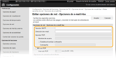 Utilice la IU remota para configurar las opciones detalladas de envío y recepción, como pueden ser las opciones para utilizar el equipo para enviar y recibir I-Faxes y las opciones para la autenticación POP y el cifrado de la comunicación antes de enviar e-mails o I-Faxes. Póngase en contacto con su proveedor o administrador de red para obtener la configuración necesaria.