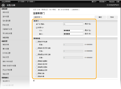 2 | 指定所需设置。 [部门识别码] 输入要注册的部门识别码数字。 [设置PIN] 若要设置 PIN,请选择此复选框,然后在 [PIN] 和 [确认] 文本框中输入相同的数字。 [限制功能] 可以限制要打印的页数以及要注册的部门的可用功能。如需限制要打印的页数,请选择目标类型的复选框,然后在 [页数] 中输入适当的页数。选择目标功能的复选框以限制功能。 如果选择了 [限制扫描] 复选框,将限制保存到 USB 存储设备、发送电子邮件以及保存到共享文件夹或 FTP 服务器这些功能。也可以通过将其导入到计算机来限制扫描文档的其他方式,但在这种情况下无法对每个部门识别码单独进行访问阻止 ( 当部门识别码未知时阻止作业)。 |