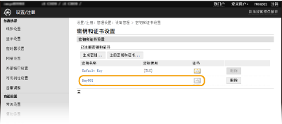 如果密钥和证书当前用于某种用途,如当 [密钥使用] 下显示 “[TLS]” 或 “[IEEE 802.1X]” 时,无法删除该密钥和证书。在此情况下,请禁用此功能或更换密钥和证书,再进行删除。