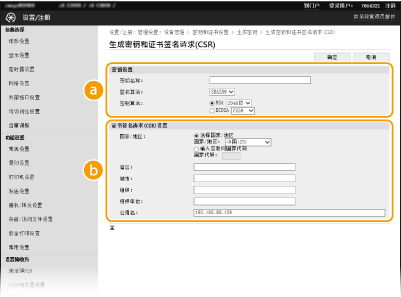 由于本机上生成的证书没有 CA 签名,根据与其通信的设备的不同,可能会导致通信错误。如需使证书颁发机构颁发带有 CA 签名的证书,您需要获取 CSR(证书签名请求)的数据,管理员可以从远程用户界面生成这些数据。当颁发证书时,将其注册在 CSR 生成的密钥中。