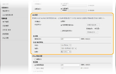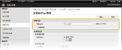 对认证本机时使用的方法选择 [预共享密钥方法] 或 [数字签名方法]。选择 [预共享密钥方法] 之前需要对远程用户界面启用 SSL。选择 [数字签名方法] 之前需要生成或安装密钥和证书。