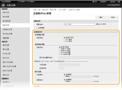 如果 [远程地址] 选择 [IPv4手动设置] 或 [IPv6手动设置],请输入要应用策略的 IP 地址。您也可以通过在地址之间插入连字符输入地址范围。