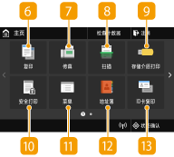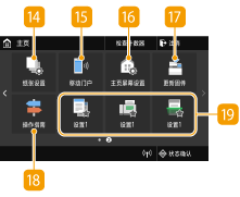 ![]() | <纸张设置>此按钮也可以用于指定纸盒和多功能托盘中装入的纸张的尺寸和类型。指定纸张尺寸和类型 <移动门户>使用此按钮可与移动设备建立连接。与移动设备连接 <主页屏幕设置>可让您更改 主页 画面按钮的显示顺序。自定义 主页 画面 <更新固件>可让您通过互联网更新固件。更新固件 <操作指南>按下可查看操作指南和错误原因/解决方法。 快捷键显示注册到复印、传真和扫描的“收藏夹设置”。向 主页 画面增加按钮 |