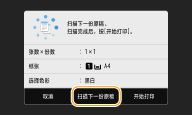 1 | 将下一份原稿放在稿台玻璃上,然后选择 <扫描下一份原稿>。 也可以为每份原稿分别指定 <选择色彩>、<原稿类型>、<浓度> 和 <色彩平衡>。 ![]() 重复此步骤,直至完成扫描整个原稿。 |