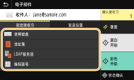 如果从 主页 画面中的 <地址簿> 选择接收方,当选定的保存位置是指定的接收方时,可以显示电子邮件发送或文件保存的基本功能画面。 |