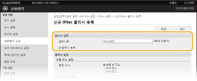 [IPv6 주소] | 기기의 IPv6 주소를 통해 송수신되는 모든 IP 패킷에 대해 IPSec을 사용하려면 선택합니다. |