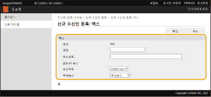 조작 패널의 <팩스 설정>( <송신>)에서 [ECM 송신] 및 [송신시작 속도]를 지정할 수도 있습니다. 그러나 주소록에 등록된 수신인의 세부 설정의 경우 <주소록>에서 지정한 설정이 활성화됩니다. |