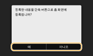 <예>를 선택하면 메시지가 표시됩니다. 메시지를 확인한 후, <확인>를 선택합니다. 등록된 설정 조합이 단축 버튼으로 홈 화면에 추가됩니다.