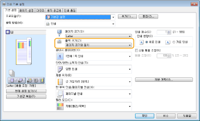 프린터 드라이버의 [출력 크기]와 인쇄할 용지의 크기를 맞춥니다.