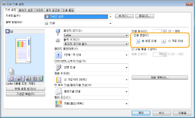 2 | 드라이버의 [기본 설정] 화면에서 [인쇄 방향]을 1단계에서 설정한 것과 같은 방향으로 설정합니다. |