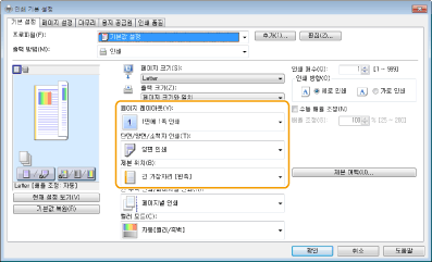 3 | 인쇄 미리 보기를 확인하는 동안 [페이지 레이아웃] [페이지 순서] [단면/양면/소책자 인쇄] [제본 위치]를 설정합니다. |