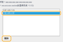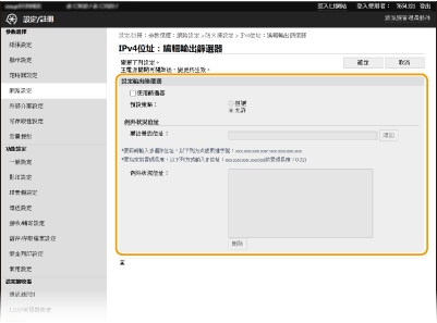 2 | 指定例外位址。 在 [要註冊的位址] 文字框中輸入 IP 位址(或 IP 位址的範圍),然後按一下 [添加]。 檢查是否輸入錯誤 IP 位址的輸入形式 | 說明 | 範例 | 輸入單一位址 | IPv4: 以句點分隔號碼。 | 192.168.0.10 | IPv6: 以冒號分隔英數字元。 | fe80::10 | 指定位址範圍 | 在位址之間插入連字號。 | 192.168.0.10-192.168.0.20 | 以前置碼指定位址範圍 | 輸入位址,接著輸入斜線和表示前置碼長度的號碼。 | 192.168.0.32/27