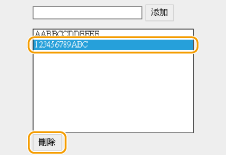 2 | 指定例外位址。 在 [要註冊的位址] 文字框中輸入 MAC 位址,然後按一下 [添加]。 不需要以連字號或冒號分隔位址。 ![]() 檢查是否輸入錯誤 如果輸入錯誤的 MAC 位址,可能無法從遠端使用者介面存取本機,在此情況下必須將 <MAC位址篩選器> 設為 <關閉>。<MAC位址篩選器> ![]() 針對輸出篩選器選擇 [拒絕] 時 無法篩選傳出多點傳送和廣播封包。 從例外情況刪除 MAC 位址 選擇 MAC 位址,然後按一下 [刪除]。 ![]() | ||||