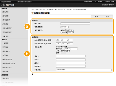 | | 若在 [簽章演算法] 中選擇 [SHA384] 或 [SHA512],則當在 [鍵值演算法] 中選擇 [RSA] 時,金鑰長度就不能選擇 [512位元]。 |