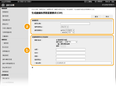 因為在本機產生的憑證並沒有 CA 簽章,所以可能會因為通訊端的裝置而出現通訊錯誤。如欲要求憑證授權單位簽發有 CA 簽章的憑證,需取得 CSR(憑證簽署要求)的資料,管理員可以透過遠端使用者介面產生這項資料。獲發憑證後,請在產生 CSR 的金鑰中註冊此憑證。