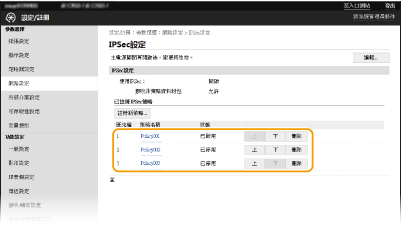 使用 IPSec 進行加密通訊之前,需註冊安全策略 (SP)。安全策略包含下方所述的設定組。註冊策略後,請指定套用順序。
