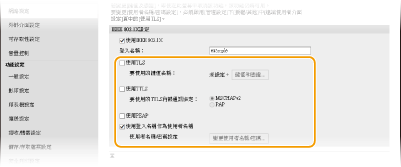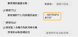 1 | 勾選 [使用TTLS] 或 [使用PEAP] 核取方塊。 TTLS 的內部通訊協定 可以選擇 MSCHAPv2 或 PAP。 |