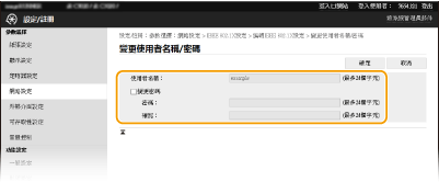 3 | 設定使用者名稱/密碼。 [使用者名稱] 輸入代表使用者名稱的英數字元。 [變更密碼] 若要設定或變更密碼,勾選此核取方塊,並在 [密碼] 和 [確認] 文字框中輸入英數字元作為新密碼。 |