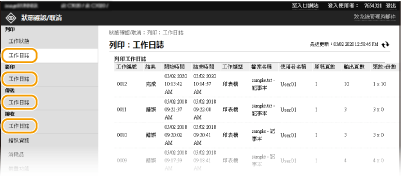 不管部門識別碼管理設定如何,將列出目前列印和等待列印的所有列印文件。 如果在登入一般使用者模式後輸入您的使用者名稱,只有您列印的文件會顯示使用者名稱。 按一下暫停文件和機密文件上的 [工作編號] 以顯示詳細資訊。您可以檢查列印件的使用者名稱和頁數。 |