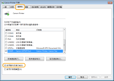 若使用網路連線且變更過本機的 IP 位址若所選連接埠的 [描述] 是 [Canon MFNP Port],且本機和電腦位於同一個子網路,則可保持連線。不需增加新的連接埠。若顯示 [標準 TCP/IP 連接埠],則需增加一個新的連接埠。 設定印表機連接埠 |