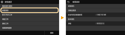 選擇 <狀態確認> 後會出現一個畫面,此畫面可用於查看文件進度,以及本機狀態(碳粉匣中剩餘的碳粉量等)和網路設定(例如本機的 IP 位址)。