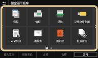 您可以將快速鍵按鈕新增至首頁畫面,以使用如 <影印>、<傳真> 和 <掃描> 等常用功能。例如,您可以給一個按鈕指派設定的順序(例如「掃描原稿的兩面,將原稿儲存為高壓縮率的 PDF 檔案,然後透過電子郵件傳送」),以便更快速有效地執行任務。