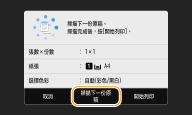 1 | 將下一份原稿放置在原稿台玻璃上,然後選擇 <掃描下一份原稿>。 也可以分別指定每一份原稿的 <選擇色彩>、<原稿類型>、<濃淡度> 和 <色彩平衡>。 ![]() 重複此步驟,直到整個原稿都完成掃描。 |