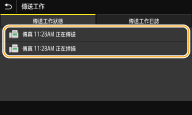 若要檢查已傳送和接收文件的狀態1 | 在 <傳送工作狀態> 或 <接收工作狀態> 標籤中選擇要查看哪一份文件的狀態。 ![]() 顯示所選文件的詳細資訊。 若指定多個接收者,畫面上會顯示已指定的接收者數目。若要查看多個指定接收者的詳細資料,請選擇 <接收者>。 |