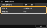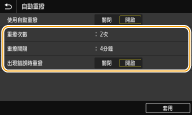 <使用自動重撥> <關閉> <開啟> ![]() <重撥次數> 1 至 2 至 10(次)<重撥間隔> 4 至 99(分鐘)<出現錯誤時重撥> <關閉> <開啟> ![]() |