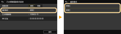 2 | <通訊模式> 選擇通訊模式。![]() <半雙工> 替傳送和接收通訊資料。本機透過半雙工連接網路裝置時選擇此項。 <全雙工> 同時傳送和接收通訊資料。此設定適用於多數環境。 |