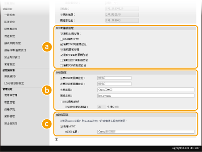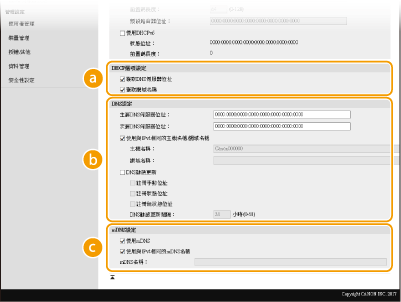 2 | 指定 IPv4 DNS 設定。 ![]() [DHCP選項設定][獲取主機名稱] 勾選此核取方塊以啟用選項 12,從 DHCP 伺服器取得主機名稱。 [DNS動態更新] 勾選此核取方塊以啟用選項 81,透過 DHCP 伺服器動態更新 DNS 記錄。 [獲取DNS伺服器位址] 勾選此核取方塊以啟用選項 6,從 DHCP 伺服器取得 DNS 伺服器位址。 [獲取網域名稱] 勾選此核取方塊以啟用選項 15,從 DHCP 伺服器取得網域名稱。 [獲取WINS伺服器位址] 勾選此核取方塊以啟用選項 44,從 DHCP 伺服器取得 WINS 伺服器位址。 [獲取SMTP伺服器位址] 勾選此核取方塊以啟用選項 69,從 DHCP 伺服器取得 SMTP 伺服器位址。 [獲取POP伺服器位址] 勾選此核取方塊以啟用選項 70,從 DHCP 伺服器取得 POP3 伺服器位址。 [DNS設定][主要DNS伺服器位址] 輸入 DNS 伺服器的 IP 位址。 [次要DNS伺服器位址] 輸入次要 DNS 伺服器的 IP 位址(如果有)。 [主機名稱] 輸入英數字元作為要登錄至 DNS 伺服器的機器之主機名稱。 [網域名稱] 輸入英數字元,代表本機所屬網域的名稱,例如「example.com」。 [DNS動態更新] 勾選此核取方塊可在每次變更本機 IP 位址時動態更新 DNS 記錄。指定更新間隔時,在 [DNS動態更新間隔] 文字框中輸入時間(以小時為單位)。 [mDNS設定][使用mDNS] Bonjour 採用的 mDNS(多點傳送 DNS)是使主機名稱與 IP 位址建立關聯的通訊協定(不使用 DNS)。勾選此核取方塊以啟用 mDNS,並在 [mDNS名稱] 文字框中輸入 mDNS 名稱。 |