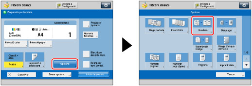 Els modes Grapar quadern i Quadern dividit només es poden fer servir si hi ha instal·lada la Unitat d'Acabat de Quaderns W1 PRO/Booklet Finisher-T1.