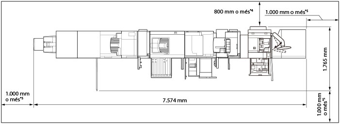 *4 A la part posterior de l'equip, assegureu-vos de deixar com a mínim 800 mm d'espai per poder fer-lo servir sense restriccions. Assegureu-vos de deixar com a mínim 100 mm d'espai si no instal·leu cap de les opcions del sistema de lliurament/recollida indicades que es mostren a la il·lustració anterior
